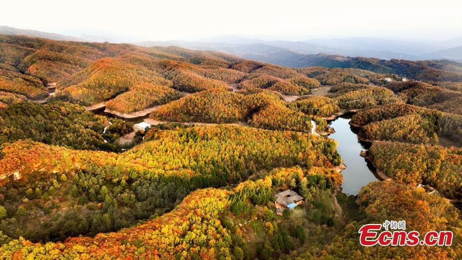 Vista aérea del hermoso paisaje forestal en el embalse de Yingxiong en Guangyuan, provincia de Sichuan, en el suroeste de China, a principios del invierno. (Foto: Servicio de Noticias de China/Miao Zhiyong.)