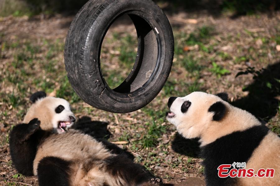 Los cachorros de panda gigante Yu Ke y Yu Ai juegan bajo el sol en el zoológico de Chongqing, el 27 de noviembre de 2023. (Foto: Servicio de Noticias de China/He Penglei)