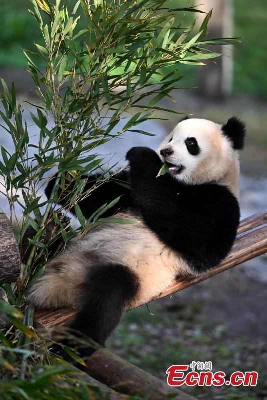 El cachorro de panda gigante Yu Ai come bambú bajo el sol en el zoológico de Chongqing, el 27 de noviembre de 2023. (Foto: Servicio de Noticias de China/He Penglei)