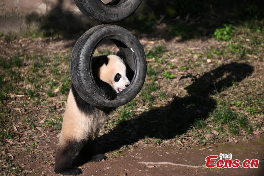 El cachorro de panda gigante Yu Ai juega bajo el sol en el zoológico de Chongqing, el 27 de noviembre de 2023. (Foto: Servicio de Noticias de China/He Penglei)