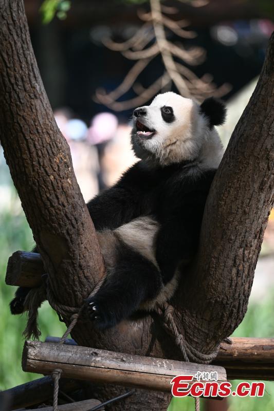El cachorro de panda gigante Yu Ai juega bajo el sol en el zoológico de Chongqing, el 27 de noviembre de 2023. (Foto: Servicio de Noticias de China/He Penglei)