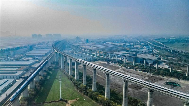 Esta foto aérea tomada el 28 de noviembre de 2023 muestra un tren de pasajeros de alta velocidad que circula por la línea ferroviaria Sichuan-Qinghai (arriba) y un tren de pasajeros de alta velocidad que circula por la línea ferroviaria de alta velocidad Xi'an-Chengdu (abajo) en Chengdu, provincia de Sichuan, suroeste de China. Un tramo de 238 kilómetros de la vía férrea Sichuan-Qinghai, en el oeste de China, entró en funcionamiento el martes tras 12 años de construcción. [Foto/Xinhua]