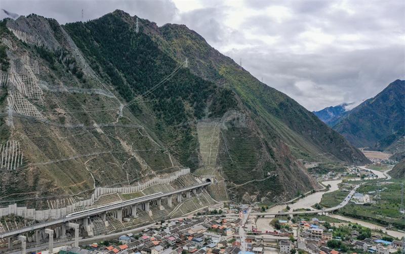 Esta foto aérea tomada el 12 de octubre de 2023 muestra un tren pasando unas pruebas para su puesta en marcha y saliendo de la estación de tren de Zhenjiangguan, en la provincia de Sichuan, en el suroeste de China. Un tramo de 238 kilómetros de la vía férrea Sichuan-Qinghai, en el oeste de China, entró en funcionamiento el martes tras 12 años de construcción. [Foto/Xinhua]