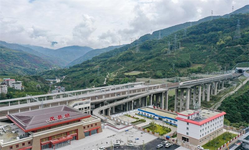 Esta foto aérea tomada el 13 de octubre de 2023 muestra un tren pasando unas pruebas para su puesta en marcha y llegando a la estación de tren de Maoxian, en el distrito de Maoxian, provincia de Sichuan, suroeste de China. Un tramo de 238 kilómetros de la vía férrea Sichuan-Qinghai, en el oeste de China, entró en funcionamiento el martes tras 12 años de construcción. [Foto/Xinhua]