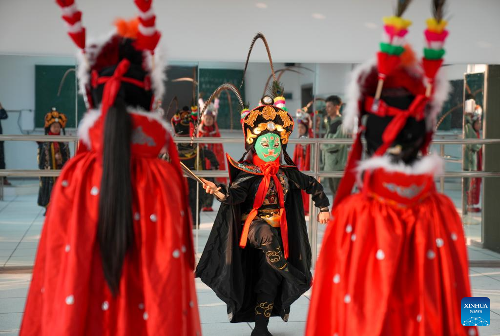 Los estudiantes practican el tradicional "bian lian", parte de un espectáculo operístico de Sichuan que consiste en cambiarse la máscara, en un aula de danza en la escuela primaria Wu'an en el distrito de Dianjiang, Chongqing, suroeste de China, el 28 de noviembre de 2023. (Xinhua/Liu Chan)