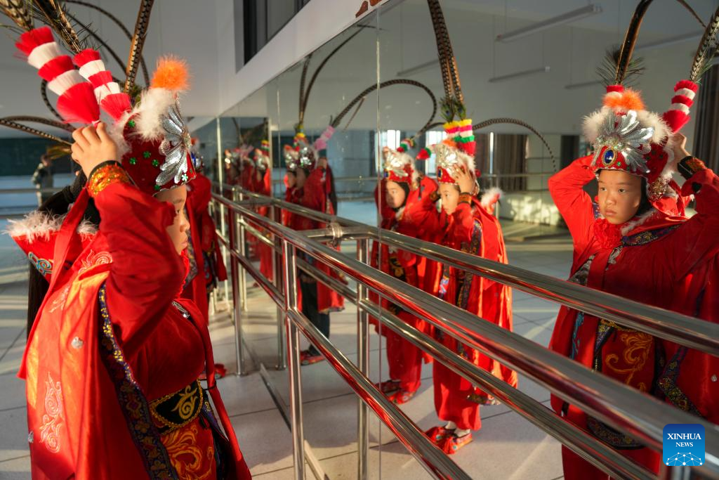 Los estudiantes se preparan para practicar el tradicional "bian lian", parte de un espectáculo operístico de Sichuan que consiste en cambiarse la máscara, en un aula de danza en la escuela primaria Wu'an en el distrito de Dianjiang, Chongqing, suroeste de China, el 28 de noviembre de 2023. (Xinhua/Liu Chan)