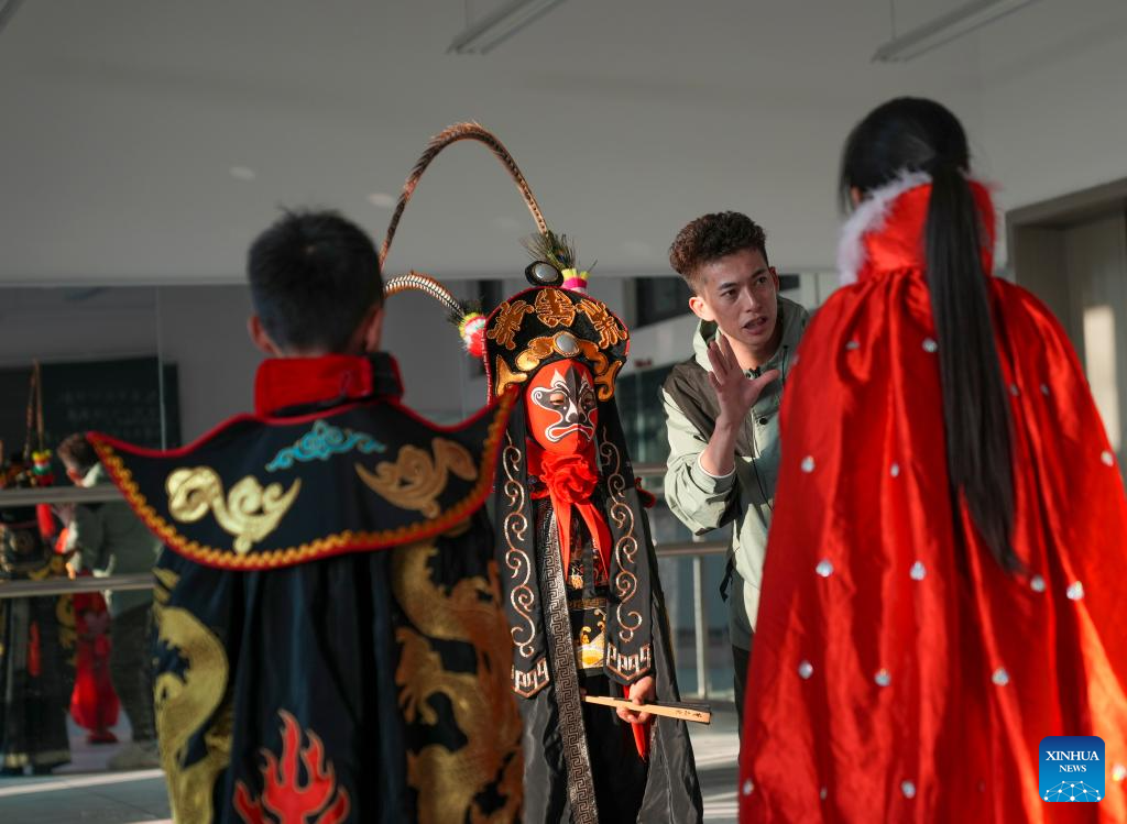 El artista folclórico Li Yong (2.º der.) explica el tradicional "bian lian", parte de un espectáculo operístico de Sichuan que consiste en cambiarse la máscara, en un aula de danza en la escuela primaria Wu'an en el distrito de Dianjiang, Chongqing, suroeste de China, el 28 de noviembre de 2023. (Xinhua/Liu Chan)