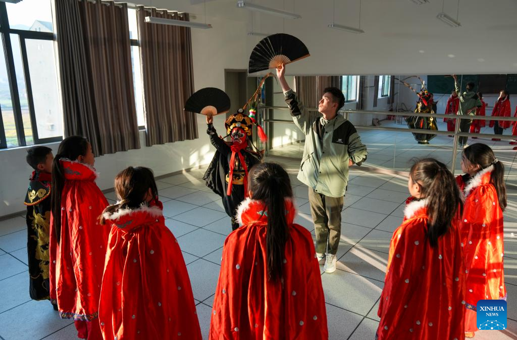 El artista folclórico Li Yong demuestra algunos gestos del tradicional "bian lian", parte de un espectáculo operístico de Sichuan que consiste en cambiarse la máscara, en un aula de danza en la escuela primaria Wu'an en el distrito de Dianjiang, Chongqing, suroeste de China, el 28 de noviembre de 2023. (Xinhua/Liu Chan)