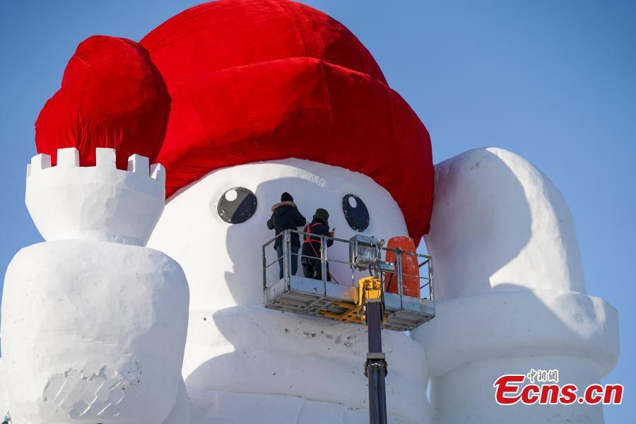 La construcción de un emblemático muñeco de nieve está a punto de terminar en Harbin, provincia nororiental china de Heilongjiang, el 3 de diciembre de 2023. (Foto: Servicio de Noticias de China/Zhao Yuhang.)