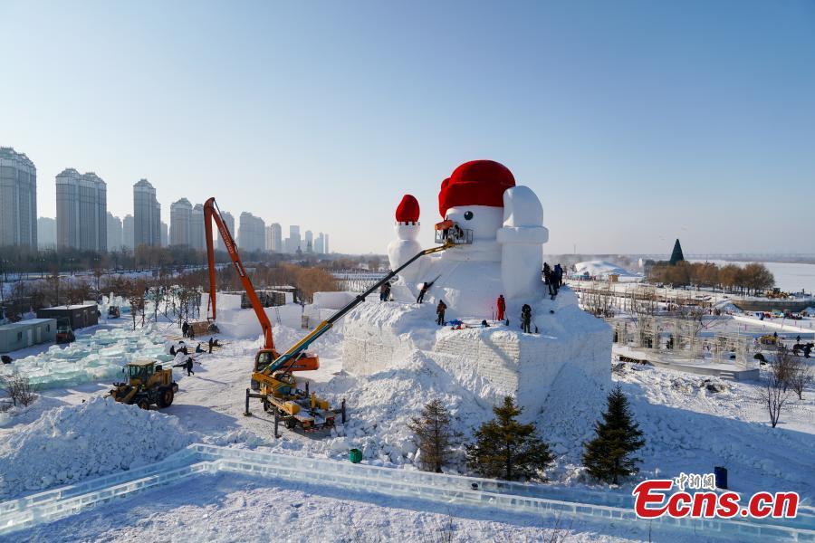 La construcción de un emblemático muñeco de nieve está a punto de terminar en Harbin, provincia nororiental china de Heilongjiang, el 3 de diciembre de 2023. (Foto: Servicio de Noticias de China/Zhao Yuhang.)