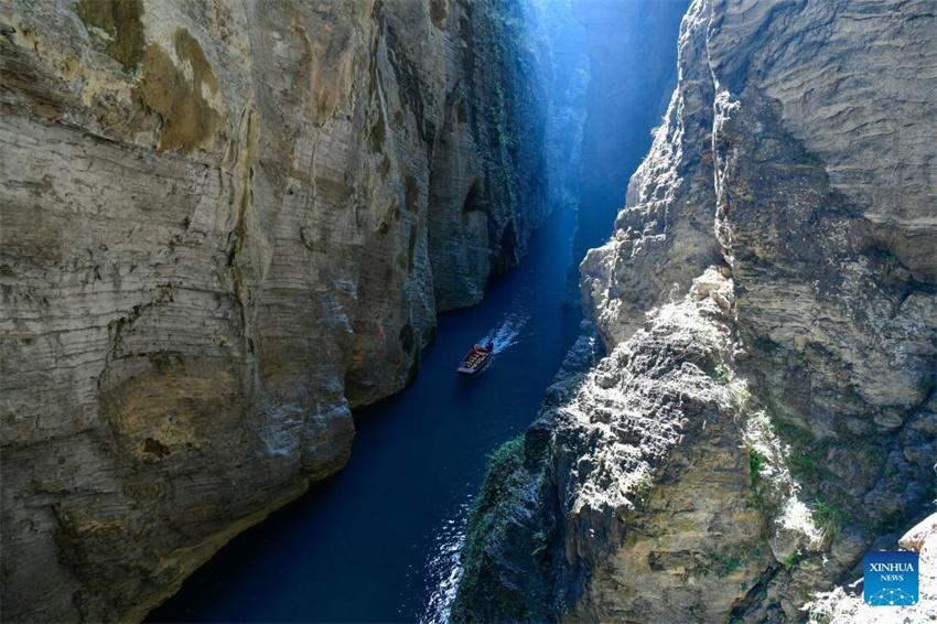 Esta foto muestra una vista del cañón de Pingshan, una atracción turística famosa por sus aguas cristalinas, en el distrito de Hefeng, en la prefectura autónoma de las etnias miao y tujia de Enshi, provincia central china de Hubei, el 4 de diciembre de 2023. (Xinhua/Yang Wenbin.)
