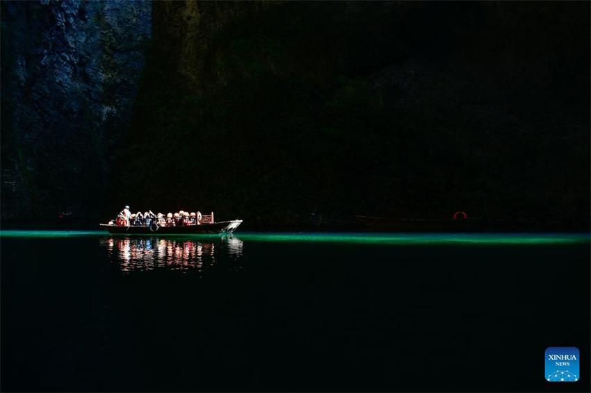 Turistas disfrutan de la vista del cañón de Pingshan, una atracción turística famosa por sus aguas cristalinas, en el distrito de Hefeng, en la prefectura autónoma de las etnias miao y tujia de Enshi, provincia central china de Hubei, el 4 de diciembre de 2023. (Xinhua/Yang Wenbin.)