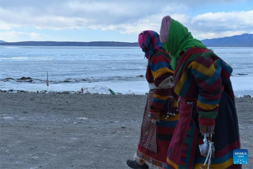 Dos personas caminan junto al lago Mapam Yumco en el distrito de Burang de la prefectura de Ngari, en la región autónoma de Xizang, suroeste de China, el 29 de enero de 2024. Situado a una altitud de 4588 metros, el lago Mapam Yumco es considerado uno de los tres lagos sagrados de Xizang. (Xinhua/Liu Wenbo.)