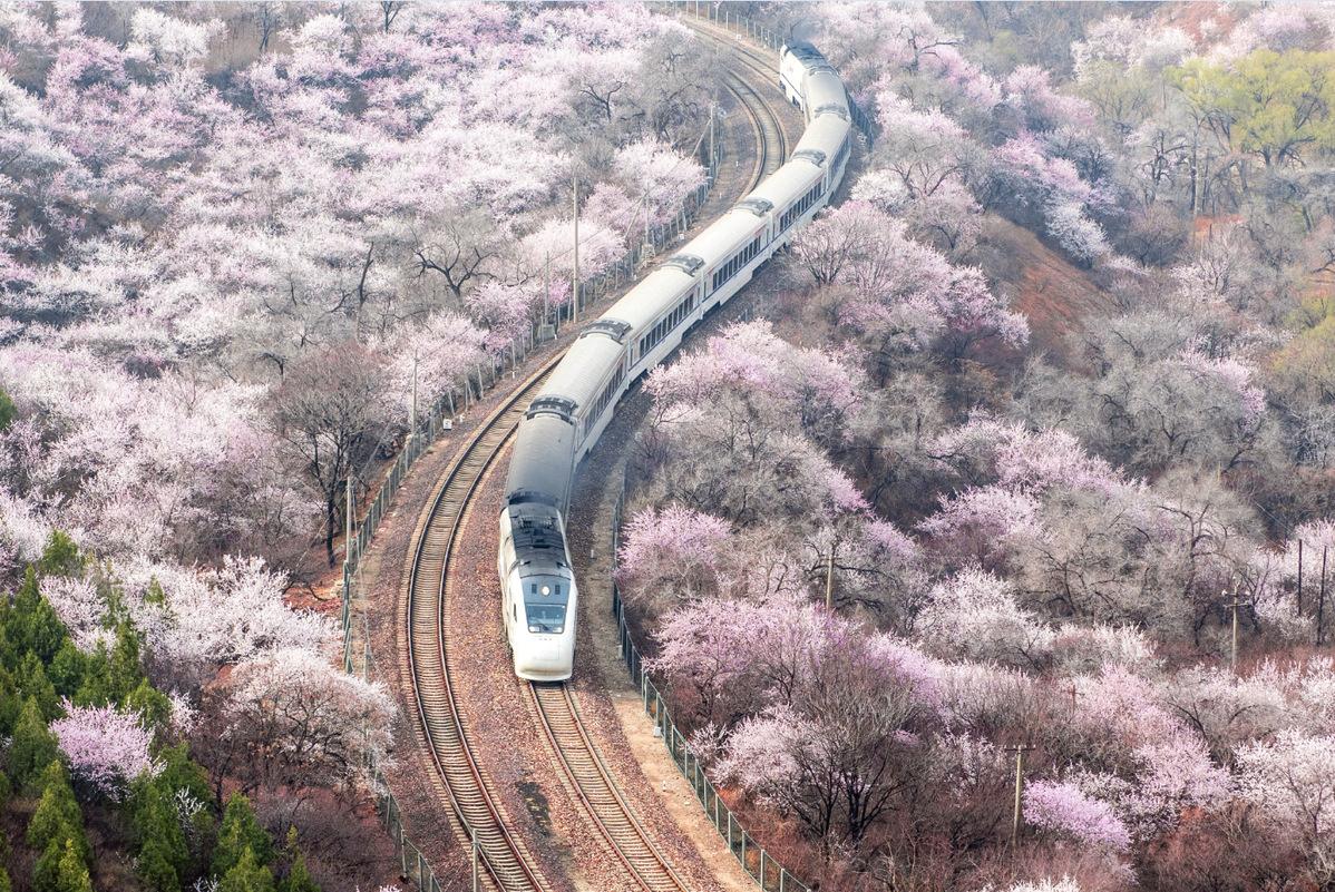 Un tren llamado Línea S2 serpentea a través de melocotoneros en flor cerca del Paso de Juyongguan. Los trenes que viajan en esta línea han recibido el apodo de “los trenes de la primavera” por parte de los turistas.