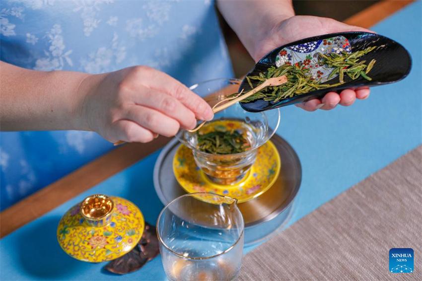 Wang Sun prepara una bebida té en Demingshe, una escuela de formación profesional en el arte del té en la ciudad de Huangshan, provincia oriental china de Anhui, el 23 de mayo de 2024. (Xinhua/Du Yu.)