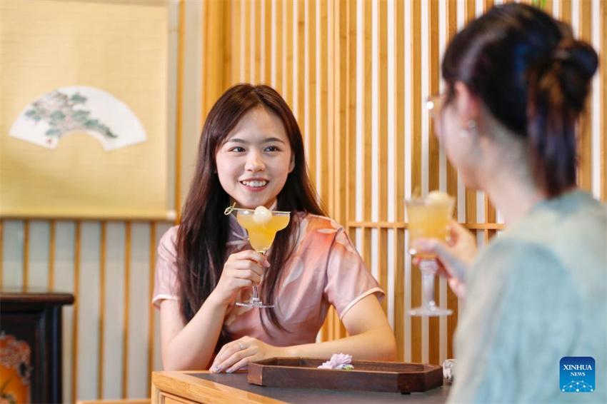 Clientes toman bebidas de té en un establecimiento de la ciudad de Huangshan, provincia oriental china de Anhui, el 23 de mayo de 2024. (Fotografía de Shi Yalei/Xinhua.)