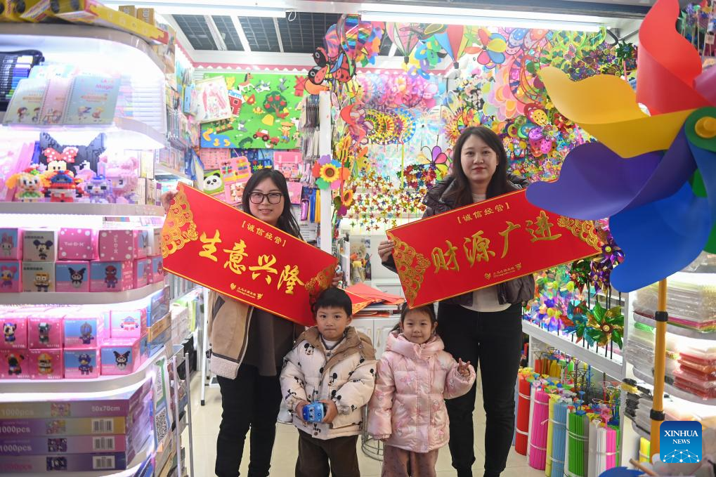 Comerciantes muestran adornos de la Fiesta de la Primavera en el Mercado de Comercio Internacional de Yiwu, provincia oriental china de Zhejiang, el 9 de febrero de 2025. Los comerciantes del Mercado de Comercio Internacional de Yiwu dieron la bienvenida el domingo a su primer día de negocios en el Año de la Serpiente. (Xinhua/Huang Zongzhi.)