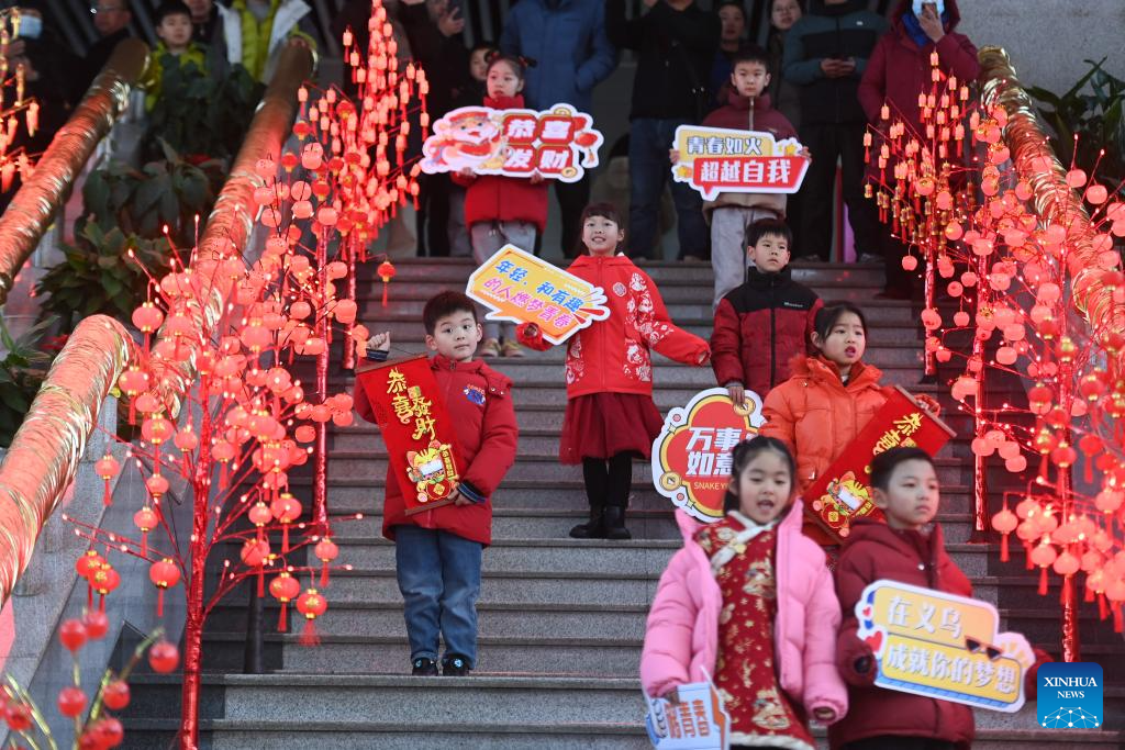 Niños actúan en el Mercado de Comercio Internacional de Yiwu, provincia oriental china de Zhejiang, el 9 de febrero de 2025. Los comerciantes del Mercado de Comercio Internacional de Yiwu dieron la bienvenida el domingo a su primer día de negocios en el Año de la Serpiente. (Xinhua/Huang Zongzhi.)