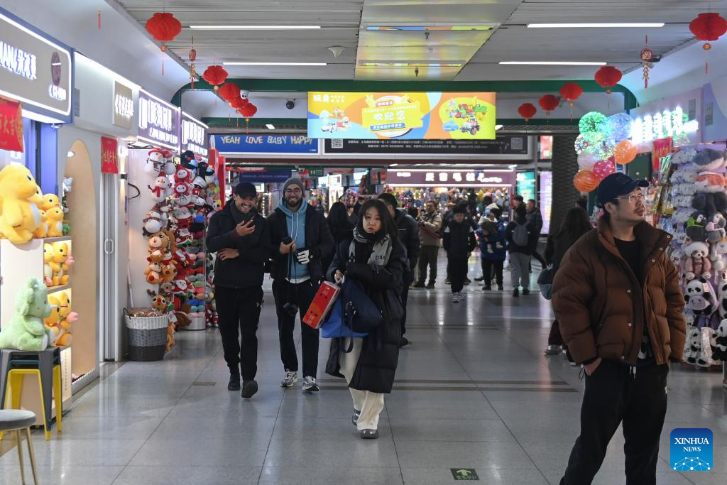 La gente visita el Mercado de Comercio Internacional de Yiwu, provincia oriental china de Zhejiang, el 9 de febrero de 2025. Los comerciantes en el Mercado de Comercio Internacional de Yiwu dieron la bienvenida el domingo a su primer día de negocios en el Año de la Serpiente. (Xinhua/Huang Zongzhi.)