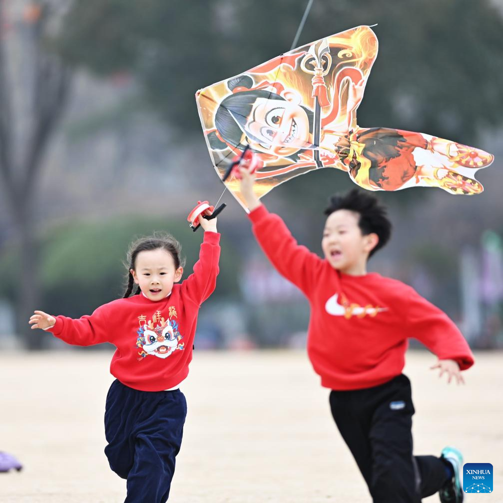 Unos niños vuelan cometas en un parque de la ciudad de Tengzhou, en la provincia oriental china de Shandong, el 1 de marzo de 2025. (Fotografía de Li Zhijun/Xinhua.)
