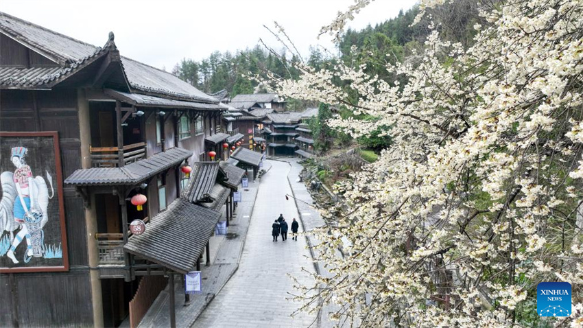 Una foto aérea tomada por un dron el 4 de marzo de 2025 muestra una vista de la antigua ciudad de Youzhou, en el distrito autónomo de las etnias tujia y miao de Youyang, en la municipalidad suroccidental china de Chongqing. (Fotografía de Qiu Hongbin/Xinhua.)