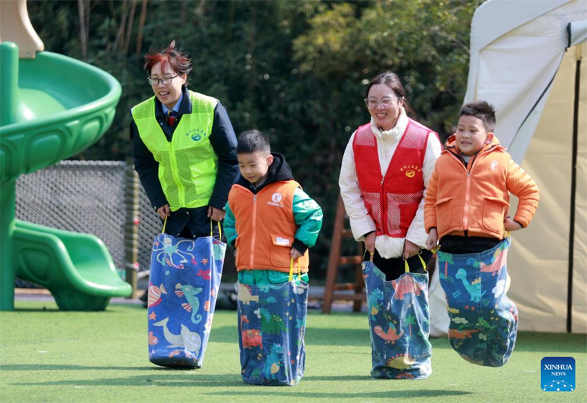 Voluntarias juegan con niños durante un acto de celebración del Día Internacional de la Mujer en una guardería de Yangzhou, provincia oriental china de Jiangsu, el 6 de marzo de 2025. (Fotografía de Meng Delong/Xinhua.)