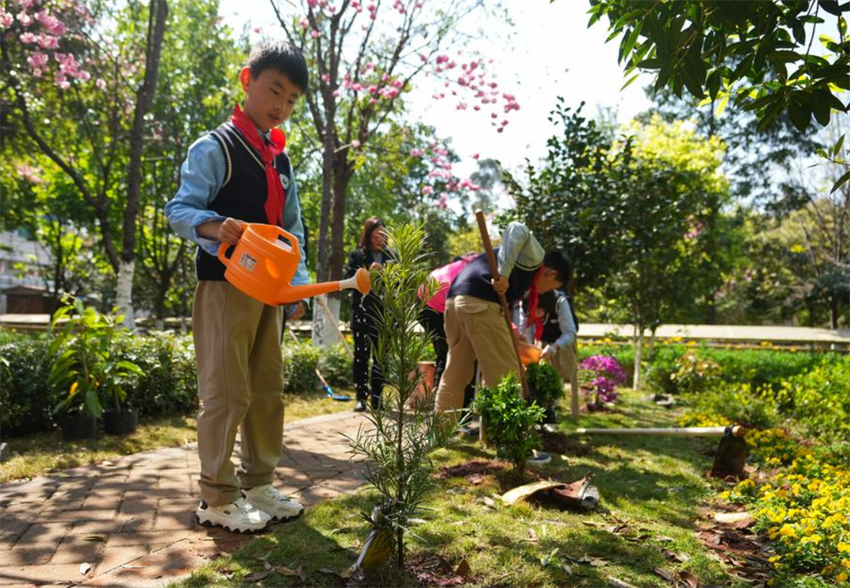 Un niño riega árboles jóvenes en el distrito de Panlong, en Kunming, provincia suroccidental china de Yunnan, el 11 de marzo de 2025. (Xinhua/Chen Xinbo.)