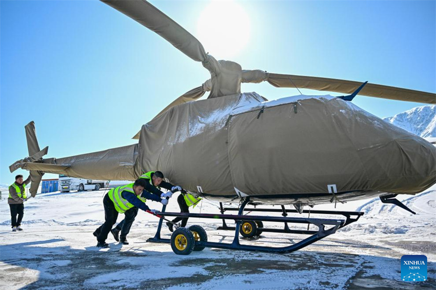 Mirbek Tlobek (2.º izq.) y sus colegas limpian el aeródromo de una empresa de aviación general en la prefectura autónoma de la etnia kazaja de Ili, en la región autónoma uygur de Xinjiang, en el noroeste de China, el 5 de marzo de 2025. (Xinhua/Ding Lei.)