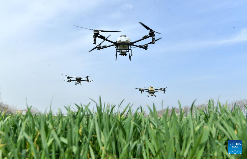 Imagen del 13 de marzo de 2025 de drones trabajando sobre un campo de trigo de una cooperativa agrícola, en el distrito de Xiayi, en la provincia de Henan, en el centro de China. Diversas tecnologías modernas están siendo usadas durante las labores agrícolas de arado de primavera en todo el país. (Xinhua/Miao Yucai)