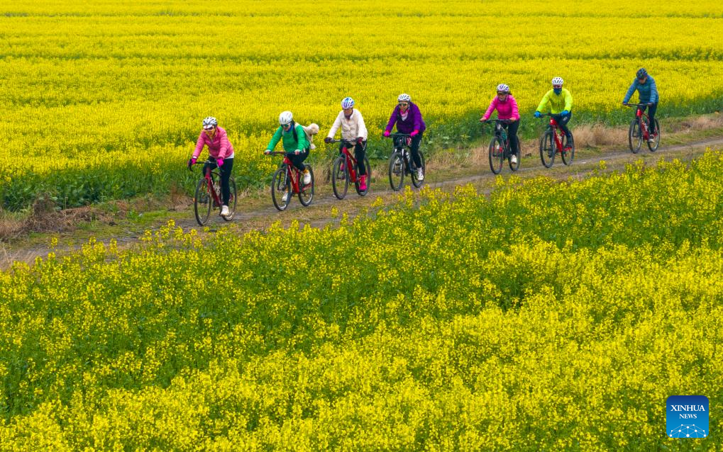 Imagen tomada con un dron el 16 de marzo de 2025 de personas circulando en bicicletas entre flores de canola, en el distrito de Fanchang de la ciudad de Wuhu, en la provincia de Anhui, en el este de China. A medida que se acerca la temporada de primavera, las flores están en plena floración en todo el país. (Xinhua/Xiao Benxiang)