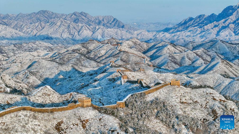 Vista aérea tomada con un dron el 16 de marzo de 2025 de una sección de la Gran Muralla después de una nevada, en el distrito de Luanping, en la provincia de Hebei, en el norte de China. (Xinhua/Liu Mancang)