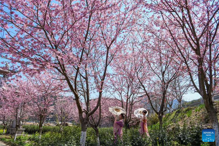 Personas con trajes tradicionales disfrutan de flores de cerezo en la ciudad de Jinhua, provincia de Zhejiang, en el este de China, el 17 de marzo de 2025. (Foto de Shi Kuanbing/Xinhua.)