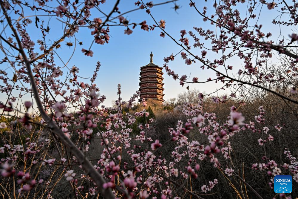 Imagen del 16 de marzo de 2025 de flores de durazno con la torre Yongding en el fondo, en el Parque de Exposiciones de Jardines de Beijing, en Beijing, capital de China. (Xinhua/Zhang Cheng)