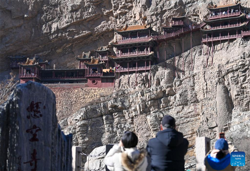 Los turistas toman fotos frente al Templo Colgante, o Templo de Xuankong, en el distrito de Hunyuan, ciudad de Datong, en la provincia de Shanxi, en el norte de China, el 28 de febrero de 2025. (Xinhua/Yang Chenguang.)