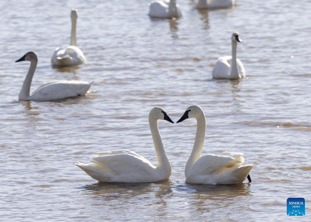 Cisnes de la tundra en el Área de Gestión de la Fauna Silvestre de Aylmer, Ontario, Canadá, el 19 de marzo de 2025. Cada año, desde finales de febrero hasta principios de abril, miles de cisnes de la tundra silvestres hacen uso del Área de Gestión de la Fauna Silvestre de Aylmer, en Ontario, para repostar en su migración a la región del Ártico. (Fotografía de Zou Zheng/Xinhua.)