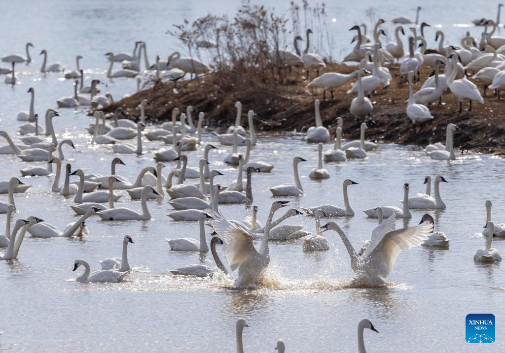 Cisnes de la tundra en el Área de Gestión de la Fauna Silvestre de Aylmer, Ontario, Canadá, el 19 de marzo de 2025. Cada año, desde finales de febrero hasta principios de abril, miles de cisnes de la tundra silvestres hacen uso del Área de Gestión de la Fauna Silvestre de Aylmer, en Ontario, para repostar en su migración a la región del Ártico. (Fotografía de Zou Zheng/Xinhua.)