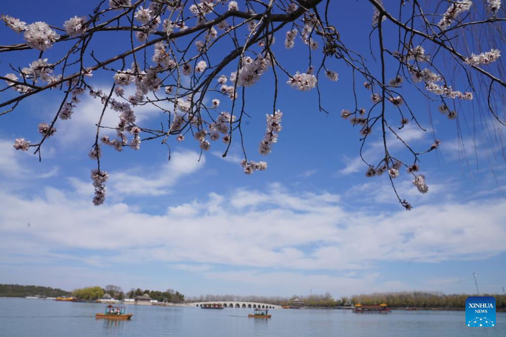 Personas navegan a bordo de botes mientras disfrutan de las flores en el Palacio de Verano, en Beijing, capital de China, el 19 de marzo de 2025. (Xinhua/Yin Dongxun)