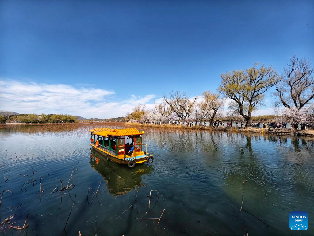 Imagen tomada con un celular el 19 de marzo de 2025 de personas navegando en botes mientras disfrutan de las flores en el Palacio de Verano, en Beijing, capital de China. (Xinhua/Xu Jinquan)
