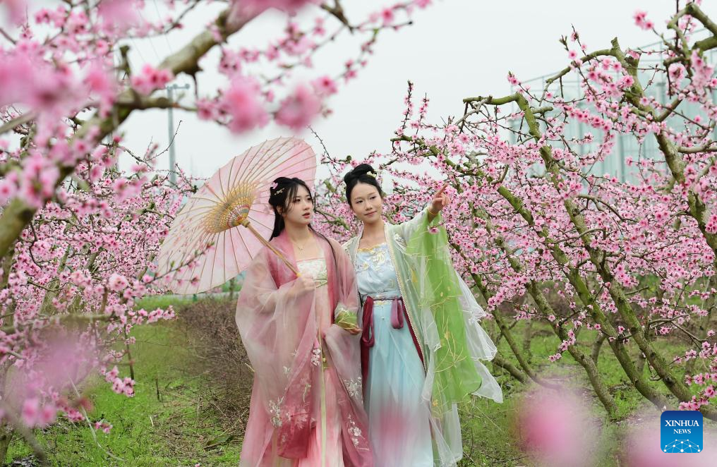 Imagen del 18 de marzo de 2025 de turistas vestidas con el tradicional atuendo Hanfu tomándose fotografías con las flores de durazno, en la aldea de Wenyong, en el poblado de Fuxin, en la ciudad de Mianzhu, provincia de Sichuan, en el suroeste de China. (Xinhua/Wang Ping)