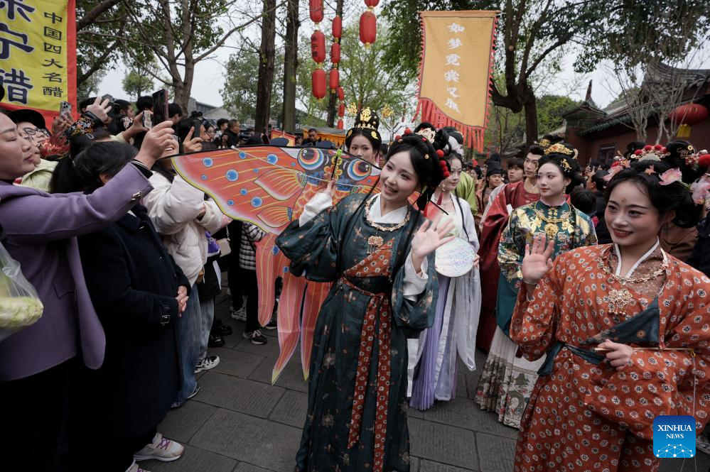 Personas en atuendos tradicionales hanfu participan en un desfile, en el antiguo poblado de Langzhong de la ciudad de Langzhong, en la provincia de Sichuan, en el suroeste de China, el 29 de marzo de 2025. Un desfile de hanfu fue celebrado aquí el sábado, atrayendo a numerosos entusiastas del hanfu de todo el país. (Xinhua/Jiang Hongjing)