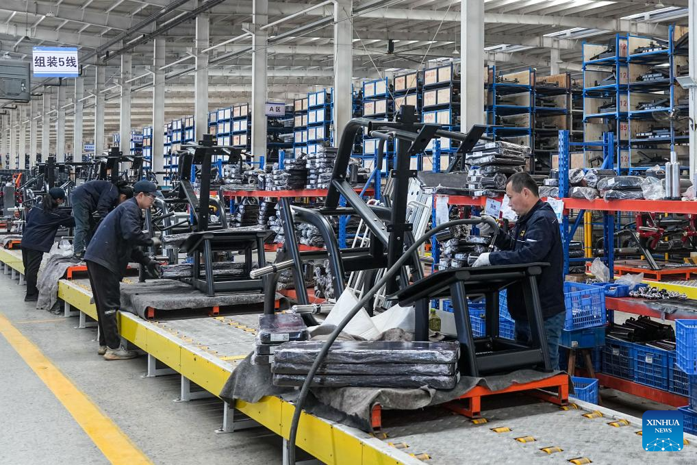 Imagen del 2 de abril de 2025 de personas trabajando en una fábrica de equipos de fitness, en el distrito de Ningjin, en la provincia de Shandong, en el este de China. El distrito de Ningjin es uno de los principales centros comerciales de fabricación de equipos de fitness de China y abasteciendo a los mercados mundiales en más de 170 países y regiones. El distrito produce más de 1.000 variantes de productos en más de 400 categorías, como máquinas aeróbicas, sistemas de entrenamiento de fuerza y aparatos de rehabilitación. Con 2.509 empresas registradas (20 de ellas fabricantes a gran escala), el valor total de la producción de la industria de equipos de fitness en Ningjin alcanzó los 13.9 billones de yuanes (unos 1.9 billones de dólares estadounidenses) en 2024. (Xinhua/Zhu Zheng)