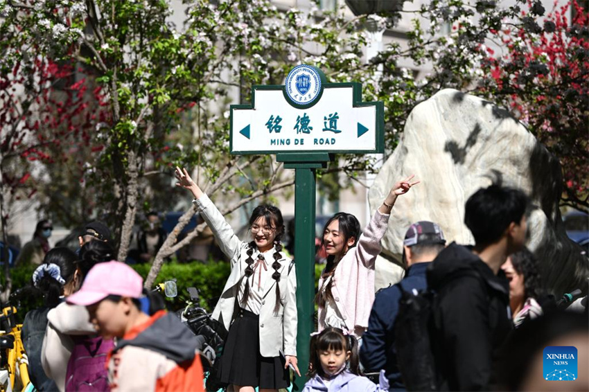 Los visitantes posan para unas fotos en el campus Weijin Road de la Universidad de Tianjin en la municipalidad septentrional china de Tianjin, el 5 de abril de 2025. (Xinhua/Li Ran.)