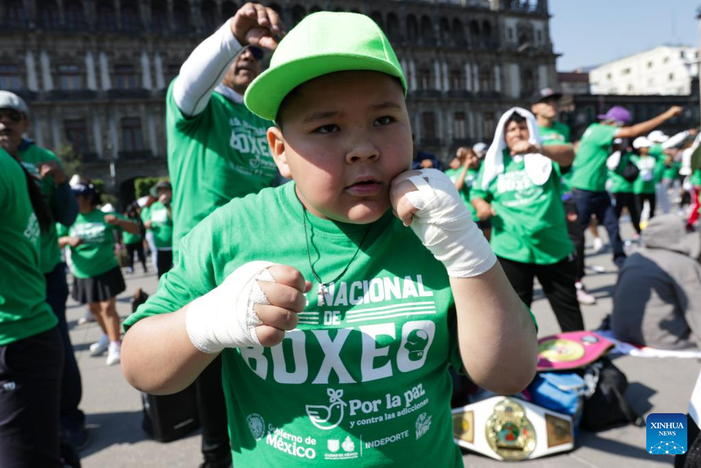 Un niño participa en la Clase Nacional de Boxeo llevada a cabo en el Zócalo de la Ciudad de México, capital de México, el 6 de abril de 2025. La presidenta mexicana, Claudia Sheinbaum, encabezó el domingo junto a varias leyendas del deporte mexicano el arranque de una clase masiva de boxeo en la plaza central de la Ciudad de México, actividad que se llevó a cabo de manera simultánea en las principales plazas de las entidades del país.(Xinhua/Francisco Cañedo)