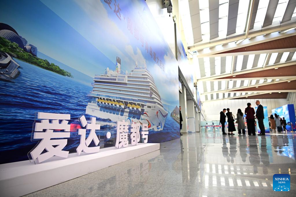 Pasajeros esperan para embarcar en el Adora Magic City en la terminal internacional de cruceros de Qingdao, provincia china de Shandong, el 6 de abril de 2025. (Xinhua/Li Ziheng.)