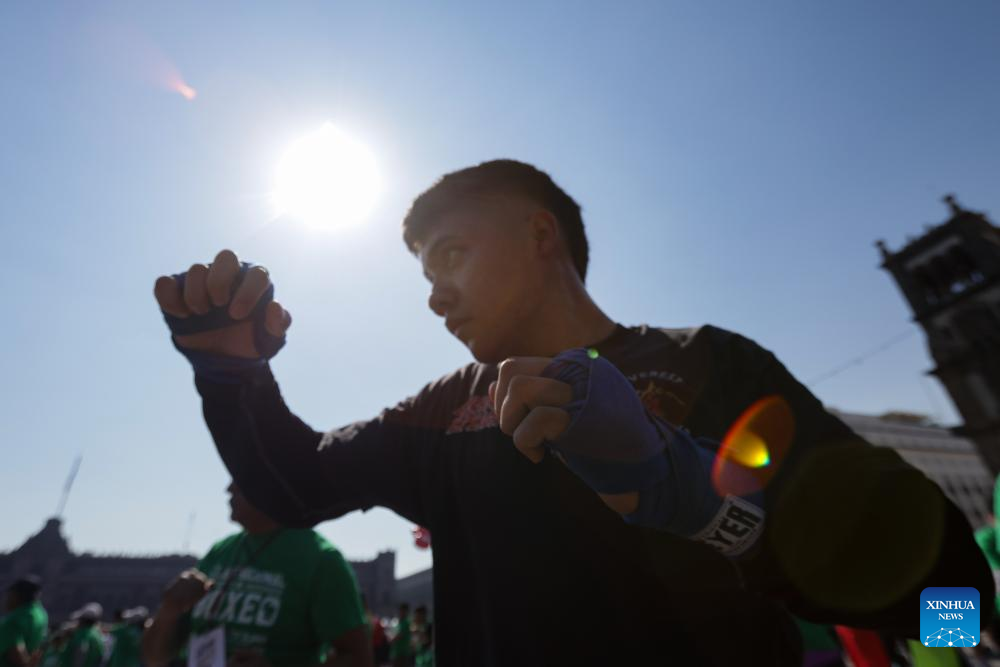 Un hombre participa en la Clase Nacional de Boxeo llevada a cabo en el Zócalo de la Ciudad de México, capital de México, el 6 de abril de 2025. La presidenta mexicana, Claudia Sheinbaum, encabezó el domingo junto a varias leyendas del deporte mexicano el arranque de una clase masiva de boxeo en la plaza central de la Ciudad de México, actividad que se llevó a cabo de manera simultánea en las principales plazas de las entidades del país.(Xinhua/Francisco Cañedo)