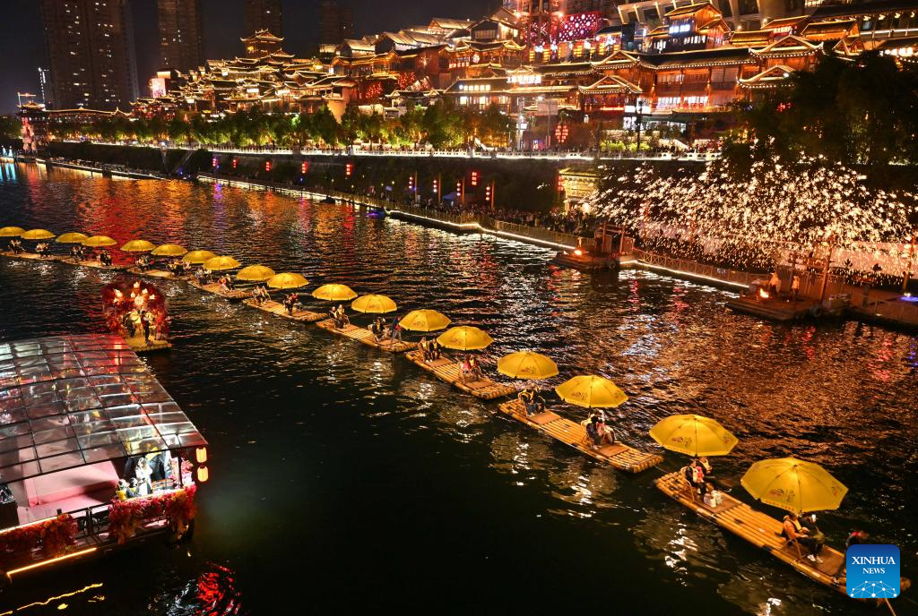 Imagen del 5 de abril de 2025 de personas realizando paseos en balsa de bambú para hacer turismo nocturno en el río Gongshui, en el distrito de Xuan'en, en la provincia de Hubei, en el centro de China. El Festival Qingming, o Día de Limpieza de Tumbas, cayó el 4 de abril este año. Es un festival chino tradicional durante el cual las personas rinden homenaje a los muertos y veneran a sus ancestros. El festival también ofrece un breve descanso para que los residentes chinos lo dediquen a actividades al aire libre y al turismo. (Xinhua/Song Wen)
