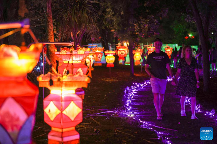 Un grupo de personas visita el Festival de Farolillos de los Jardines Osmanthus en Hastings, Nueva Zelanda, el 6 de abril de 2025. (Xinhua/Long Lei.)
