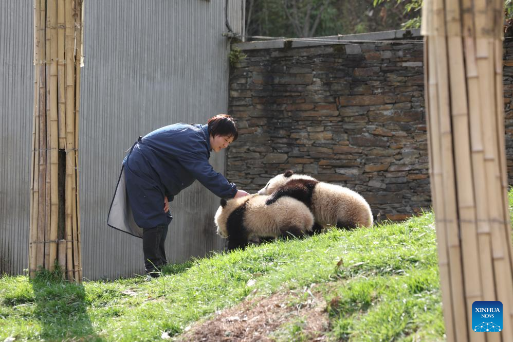 La cuidadora de pandas gigantes, Li Rong, interactúa con cachorros de panda en la base de pandas gigantes de Shenshuping de la Reserva Natural Nacional de Wolong, en la provincia suroccidental china de Sichuan, el 27 de marzo de 2025. (Xinhua/Meng Tao.)