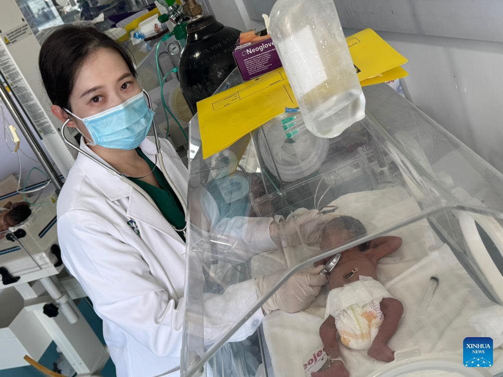 Yu Chunlin, pediatra del 34.º equipo médico chino en Zanzíbar, realiza un chequeo médico a un recién nacido en la isla de Pemba, Tanzania, el 7 de abril de 2025. (El 34.º equipo médico chino en Zanzíbar/Handout via Xinhua.)