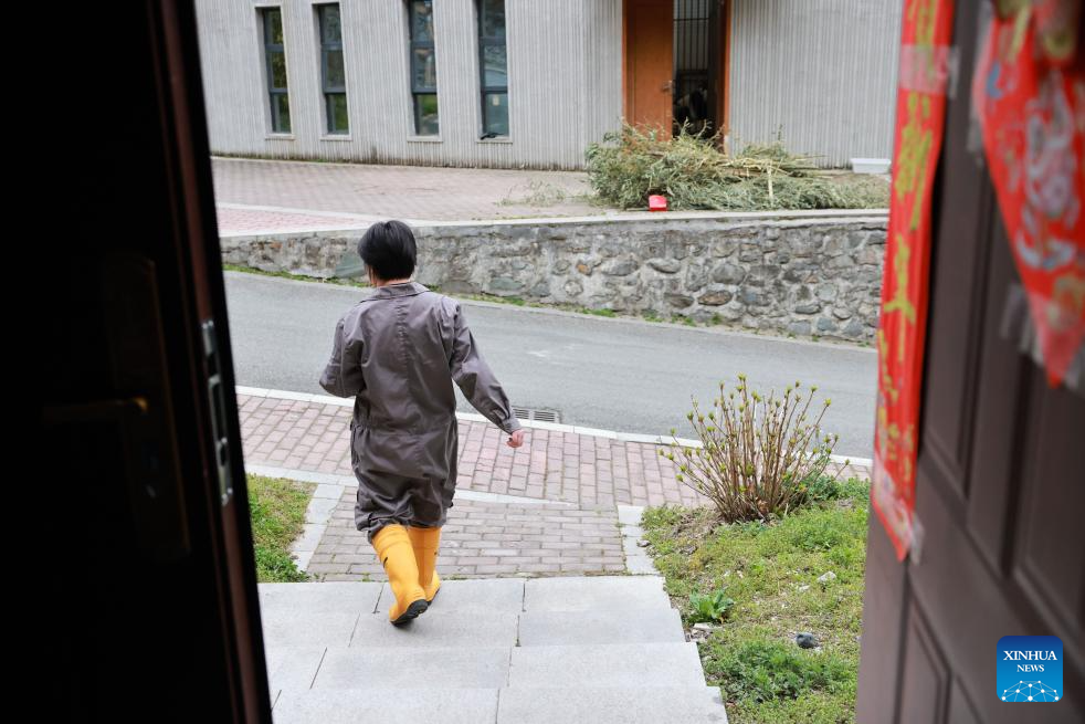 La cuidadora de pandas gigantes, Li Rong, camina hacia un recinto desde su oficina en la base de pandas gigantes de Shenshuping de la Reserva Natural Nacional de Wolong, en la provincia suroccidental china de Sichuan, el 28 de marzo de 2025. (Xinhua/Meng Tao.)
